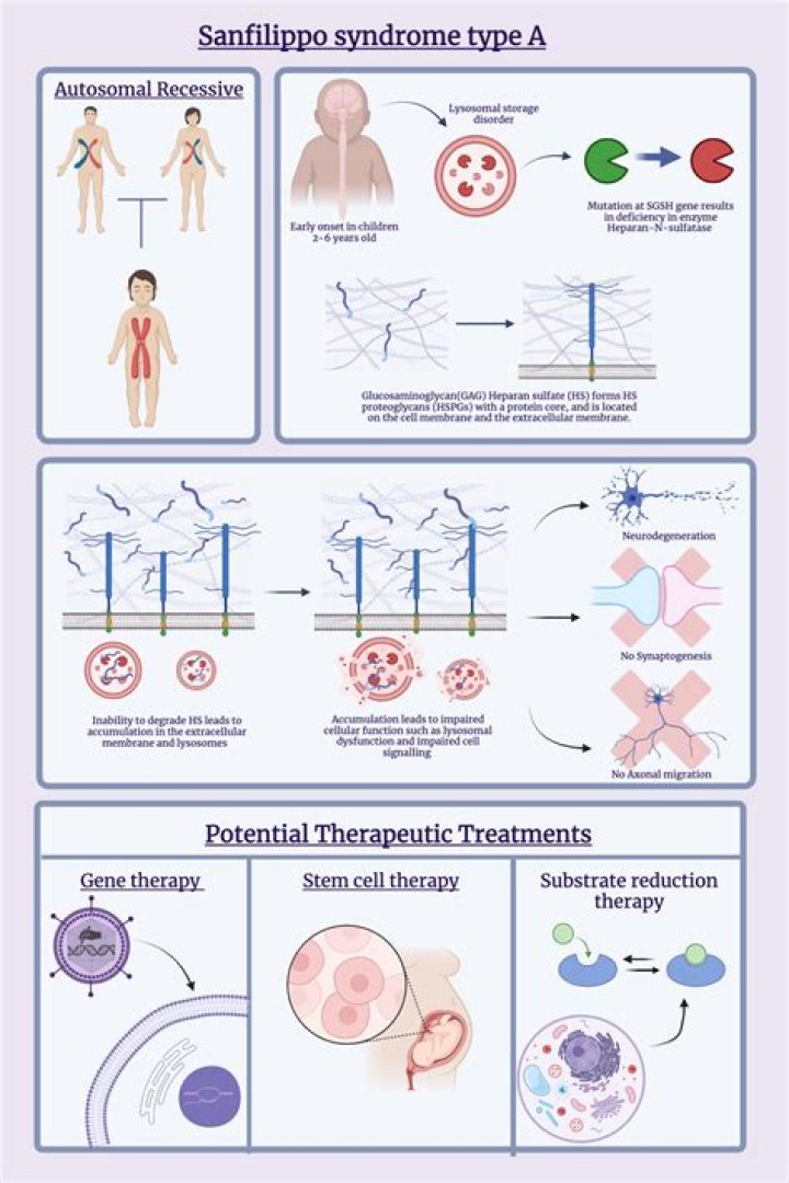 - Type A: Caused by heparan N-sulfatase deficiency.